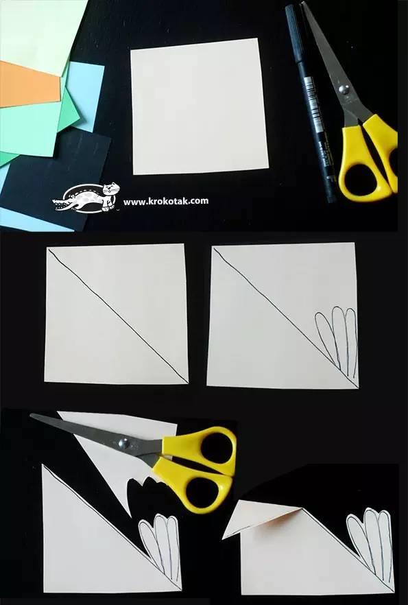 1.把正方形的白色卡紙沿對角線畫上一條線,在下端畫上尾巴的形狀。
