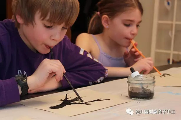 2、黑色顏料按照自己喜歡的深淺比兌,倒取一點在畫板上,讓孩子用吸管吹出樹的形狀。這個步驟充滿樂趣,孩子一定會很喜歡。