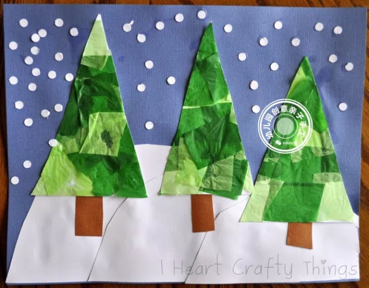 等皺紋紙粘好在白紙上後,就可以用剪刀剪出聖誕樹的形狀,把它粘貼站卡紙上,這裡Yoyo建議準備藍色的卡紙作為背景顏色。接著可以用打孔機準備一些小圓形作為雪花點綴在背景紙上,如果沒有,可以直接用棉簽以點彩畫的形式點上去。