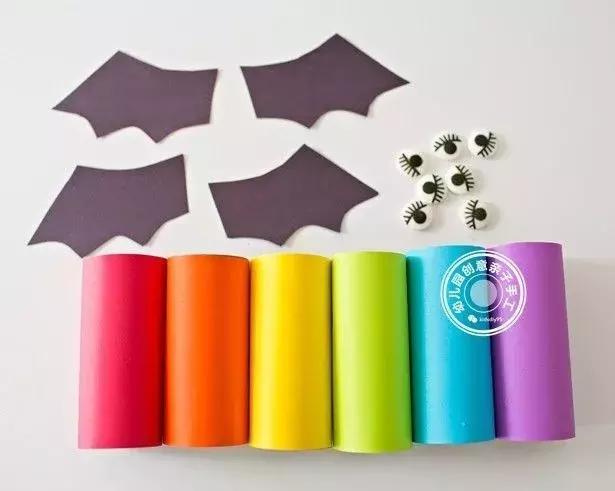 用黑色卡紙剪出蝙蝠的翅膀,粘貼在捲紙筒身體的背後。