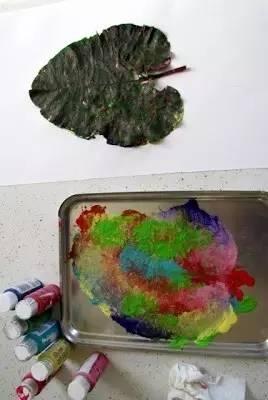 將葉子洗乾淨並且晾乾,然後塗上水粉顏料,用毛線綁起來