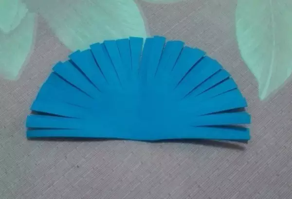 1.拿出一塊半圓形的海綿紙,將邊緣剪散開來,做孔雀的尾巴。