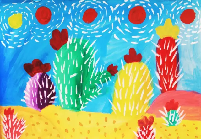 1.用水粉顏料塗滿整張畫紙,藍綠黃,有層次地塗