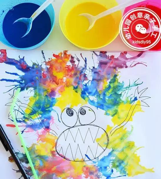 讓孩子先認真畫一個人物或者小怪獸。然後把適當稀釋了的顏料滴在人物的四周,開始用吸管吹吹吹吹吹起來~