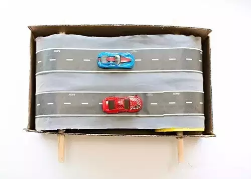 3.將一個大點的紙箱剪開,在上面畫上車道。