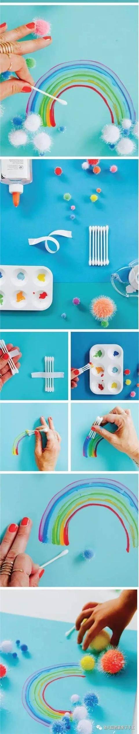 把棉簽當畫筆,沾上顏料,輕輕一畫就是一道彩虹啦!