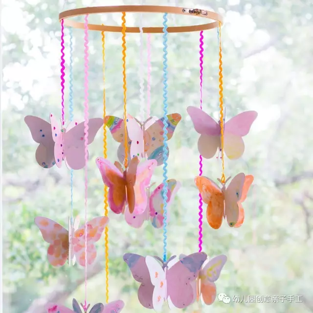 4.用絲帶連接蝴蝶與木質圓圈,就可以美美地吊起來了