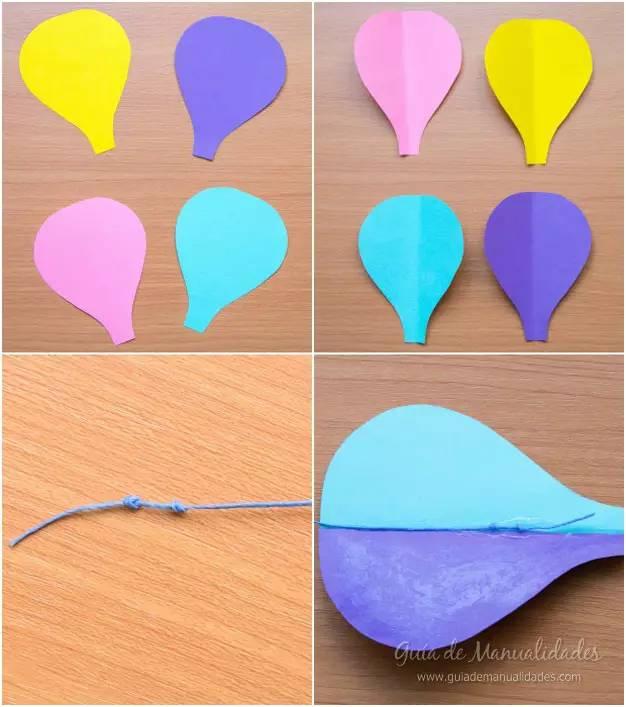 1.將各色卡紙剪成熱氣球的形狀,對摺後兩兩粘貼,在交叉處粘上懸掛的小繩子