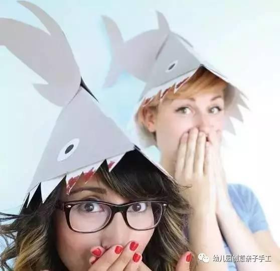 剪出鯊魚並將其黏在三角帽子的頂端,記住兩側都要黏哦。最後做出牙齒和畫出眼睛就完成咯~