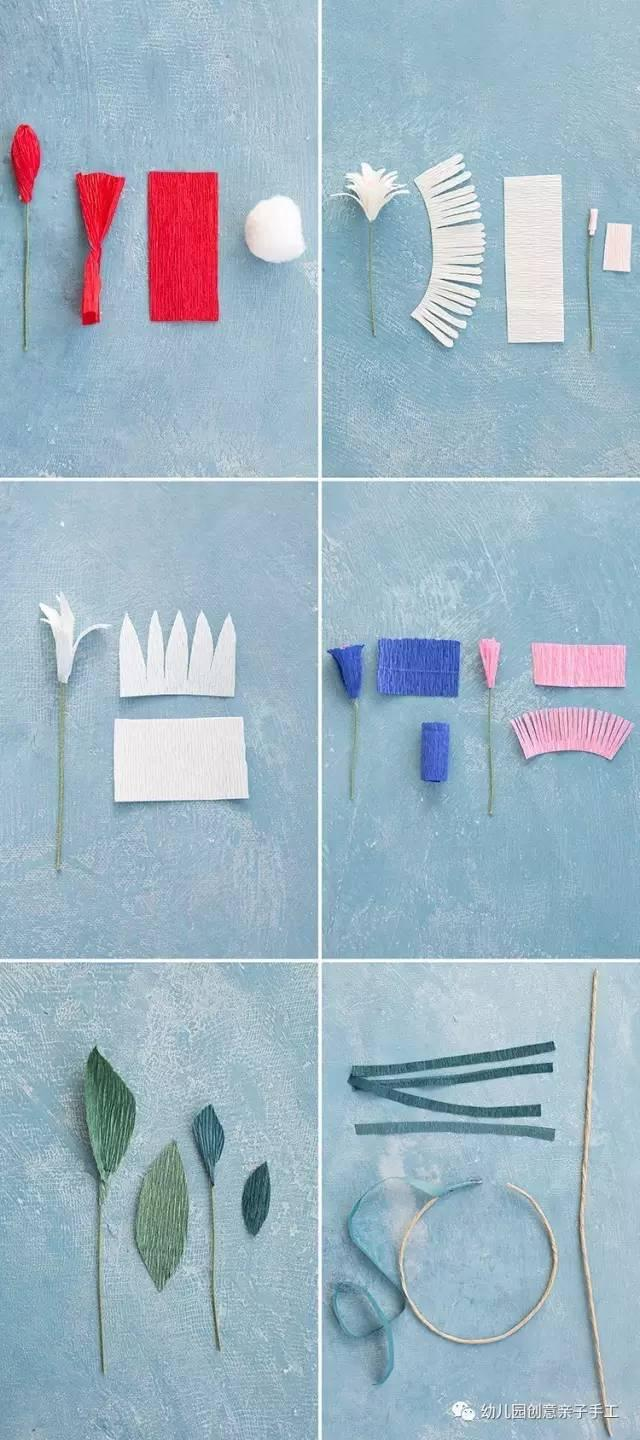 材料:彩色皺紋紙、棕色卡紙、剪刀、鉛筆、繩子、雙面膠