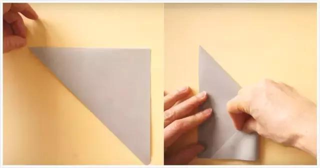 再將對摺後的三角形長邊往上翻,翻的長度以2指寬為好~