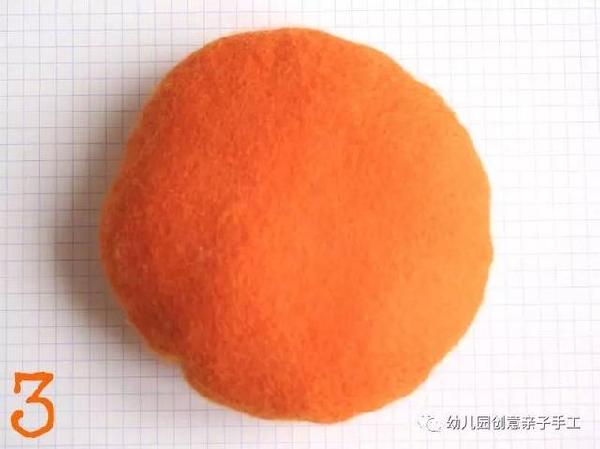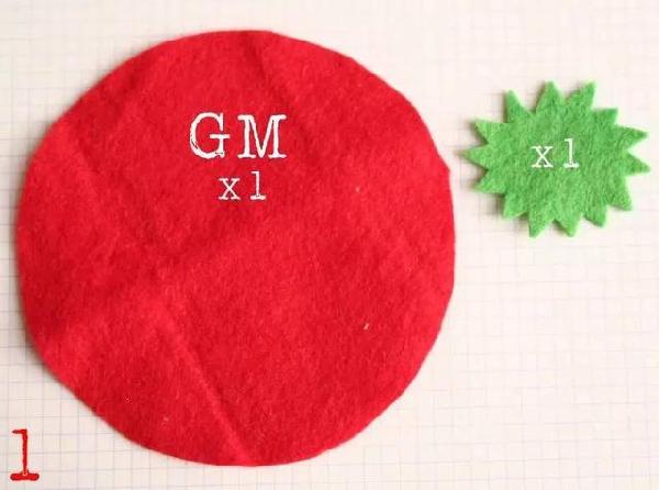 1.從橙色和綠色的織布下分別剪下兩個圓和一片葉子。