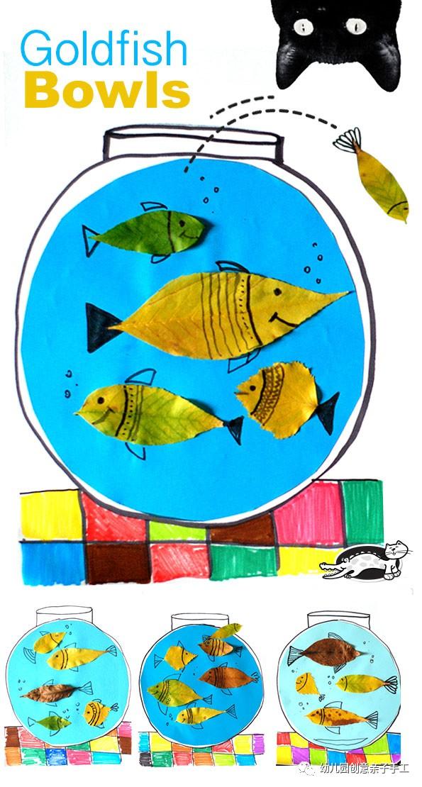 將白色卡紙作為背景,畫上我們需要的魚缸形狀,剪一個藍色的圓形卡紙,做魚缸里的水。放上幾片樹葉,在樹葉上畫出小魚的形狀就可以了!