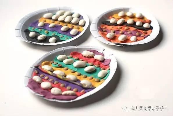 然後用橡皮泥在紙盤上粘幾層彩虹色和眉豆、紅瓜子,完成!